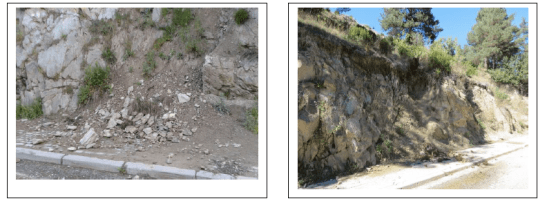 a. Les roques Pissarres ( Roca metamòrfica provinent de roques lutítiques -argiles-) que composen el subsol estan altament esquistosades ( fractures d’origen metamòrfic) en una zona d’altes pendents (arriben fins a 45 graus o més). Cal saber que aquestes roques es meteoritzen donant lloc a les roques originaries o sigui lutites – argiles- que faciliten el lliscament. Només l’eixamplament del carrer Font dels Trèmols ja està provocant freqüentes lliscaments planars . Es pot observar a les fotos inferiors tant la fracturació com la pendent.