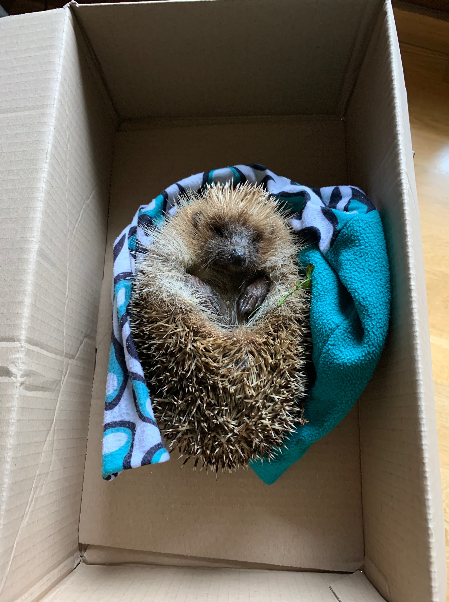 Llavors vaig anar a buscar l’eriçó, el vaig agafar amb un buff, el vaig posar en una capsa de cartró i m’el vaig endur a casa. Un cop a casa, vaig trucar al 112.